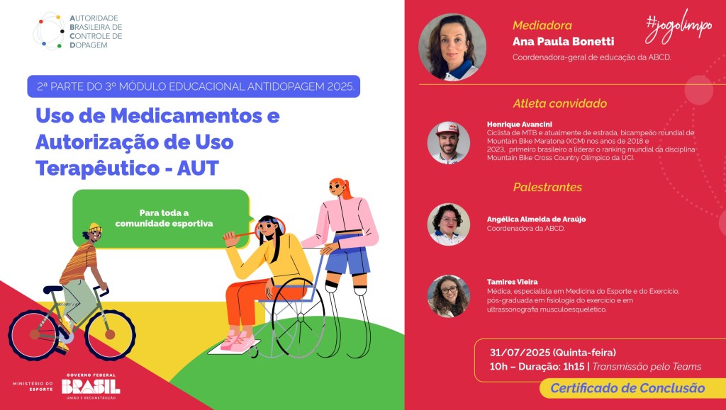 A Autoridade Brasileira de Controle de Dopagem (ABCD) realiza, nesta quinta-feira (31), a 2ª parte do 3º Módulo Educacional Antidopagem de 2025. Com o tema Uso de Medicamentos e Autorização de Uso Terapêutico (AUT), o evento será transmitido pela plataforma Microsoft Teams, a partir das 10h, com duração de 1h15. Clique aqui e faça a inscrição.