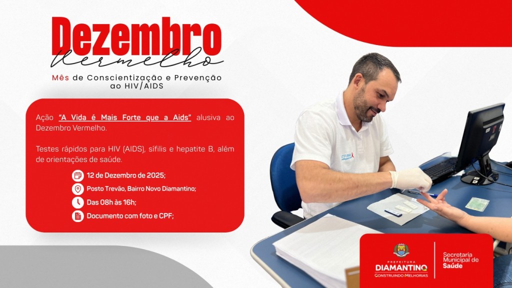 A Prefeitura de Diamantino, por meio da Secretaria Municipal de Saúde, convida a população para participar, no dia 12 de dezembro, da ação “A Vida é Mais Forte que a Aids”, alusiva ao Dezembro Vermelho. A iniciativa contará com aconselhamento e realização de testes rápidos no Posto Trevão, localizado no Bairro Novo Diamantino.