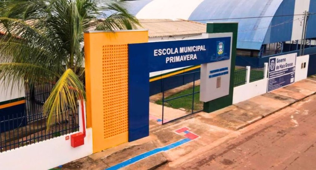 #PraTodosVerem – A imagem mostra a entrada da Escola Municipal Primavera, com portão azul e detalhes em amarelo e verde, acompanhados do brasão oficial do Estado de Mato Grosso. Ao lado, há um muro branco com a identificação do Poder Legislativo estadual. Em frente, uma calçada e uma rua pavimentada completam a cena, transmitindo a ideia de organização e infraestrutura escolar.