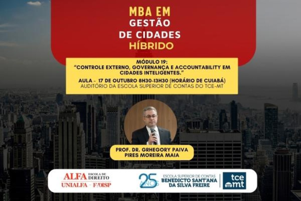 O Tribunal de Contas de Mato Grosso (TCE-MT) promove, nesta sexta-feira (17), o 19º módulo do MBA em Gestão de Cidades. Com o tema “Controle externo, governança e accountability em cidades inteligentes”, a aula abordará tópicos como análise dos mecanismos de controle externo, práticas de governança pública e instrumentos de accountability aplicados às cidades inteligentes com foco na transparência, participação cidadã e uso de tecnologias para o controle social.