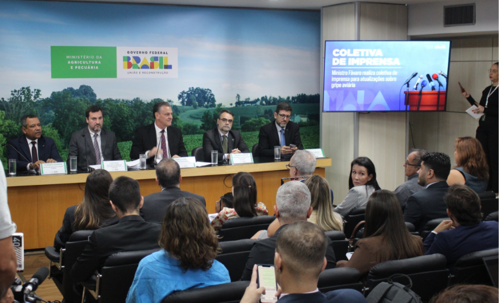 O ministro da Agricultura e Pecuária, Carlos Fávaro, concedeu entrevista coletiva nesta quarta-feira (4), na sede do Ministério, em Brasília, para atualizar a imprensa sobre a situação da gripe aviária no Brasil. Na ocasião, reforçou o compromisso do governo com a transparência, a sanidade animal e a segurança dos alimentos, destacando a eficácia do sistema brasileiro frente à emergência zoossanitária.