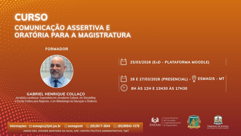 A iniciativa, que ocorre de 25 a 27 de março, integra o calendário de capacitações da Escola Superior da Magistratura de Mato Grosso (Esmagis-MT) e reforça o compromisso da instituição com o desenvolvimento das competências essenciais ao exercício da jurisdição, especialmente no campo da comunicação profissional.