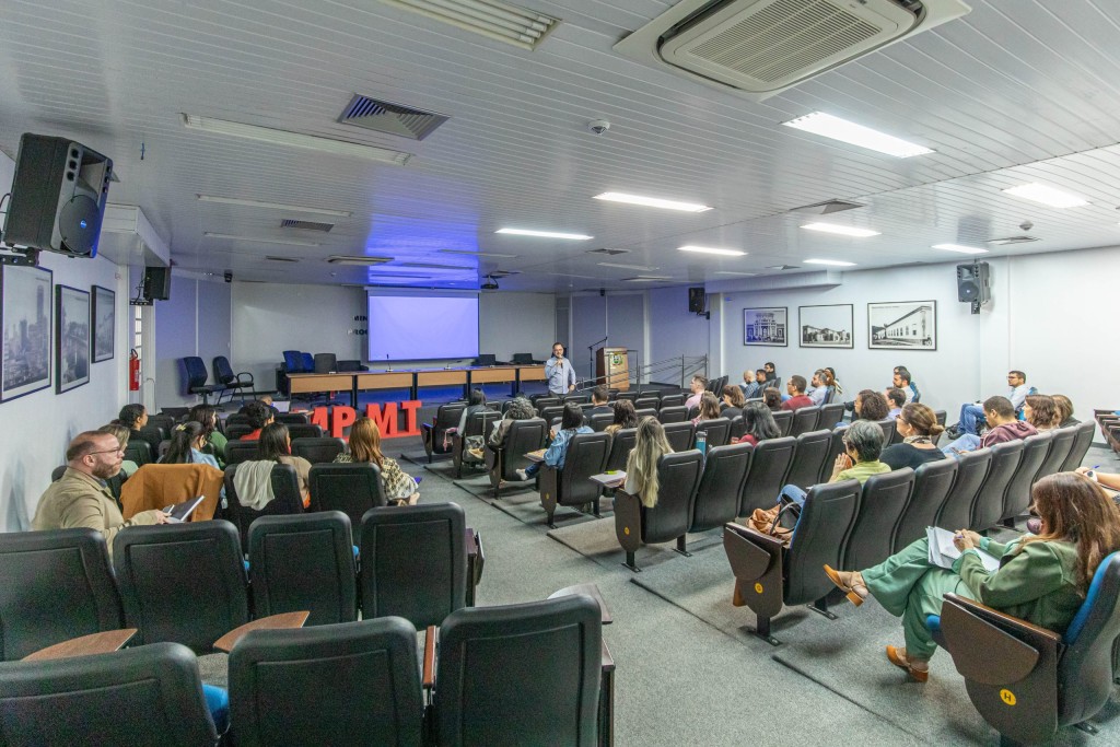 A foto ilustra uma imagem de um auditório no qual um grupo de pessoas estão sentadas acompanhando uma palestra.