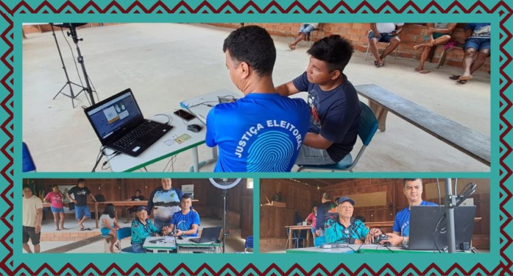 #PraTodosVerem: A imagem mostra servidor da Justiça Eleitoral realizando atendimentos a eleitores indígenas. Em diferentes momentos, é possível ver pessoas sendo atendidas em mesas com computador, câmera e equipamentos de biometria, em um ambiente simples, com paredes de madeira e tijolos aparentes. Outras pessoas aguardam o atendimento ao fundo. O layout da imagem tem moldura com padrão gráfico colorido em verde e vermelho.