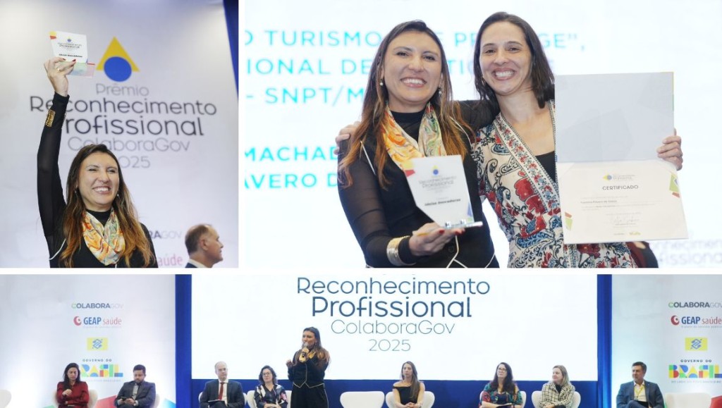 PRÊMIO – Durante a solenidade, servidores do Ministério do Turismo também foram reconhecidos em diferentes categorias. O ColaboraGov valoriza o trabalho de profissionais e equipes que se destacam na Administração Pública Federal, contemplando quatro modalidades: Ideias Inovadoras, Desempenho Funcional, Jubileu de Prata (25 anos de serviço) e Jubileu de Ouro (50 anos de serviço).