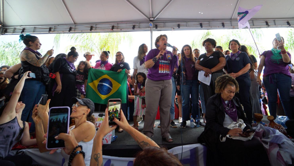 Em Brasília, a manifestação aconteceu pela manhã, na Torre de TV, e contou com a presença da ministra das Mulheres, Márcia Lopes, que participou do ato ao lado da primeira-dama Janja Lula da Silva, e das ministras Anielle Franco (Igualdade Racial), Gleisi Hoffmann (Secretaria de Relações Institucionais), Sonia Guajajara (Povos Indígenas), Esther Dweck (Gestão e da Inovação em Serviços Públicos), e Luciana Santos (Ciência, Tecnologia e Inovação).