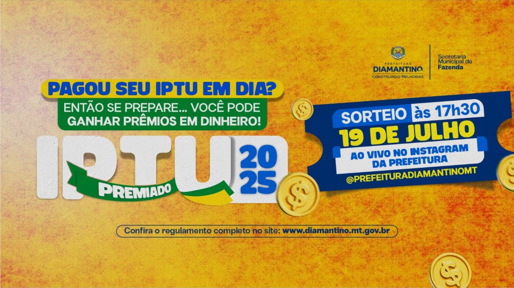 A Prefeitura de Diamantino, por meio da Secretaria de Fazenda, realizou no último dia 9 de julho o primeiro sorteio da campanha IPTU Premiado 2025. A iniciativa, que reconhece os contribuintes em dia com seus tributos, contemplou inicialmente quatro participantes, distribuindo um total de R$6 mil em prêmios.