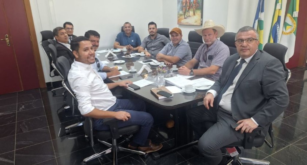 #PraTodosVerem – A imagem mostra o desembargador Marcos Henrique Machado ao lado dos prefeitos de Tabaporã, Novo Horizonte do Norte e Porto dos Gaúchos, além de assessores, reunidos em torno de uma mesa de reuniões. Eles estão sentados em cadeiras executivas, com documentos, celulares e xícaras de café sobre a mesa. O ambiente é formal, com bandeiras ao fundo e um quadro decorativo na parede, indicando que se trata de uma reunião institucional.