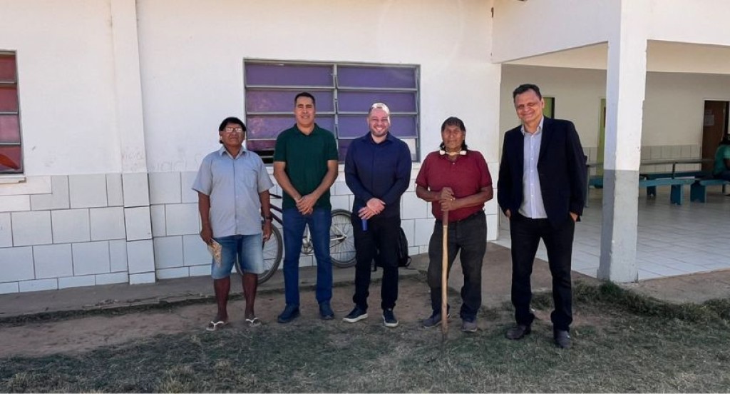#PraTodosVerem – Na imagem, cinco homens posam lado a lado em frente a um prédio de paredes brancas e janelas com vidro roxo. Dois deles vestem trajes casuais indígenas, enquanto os outros três usam roupas formais ou semiformais. O grupo está em uma área externa, sobre um gramado, próximo a uma calçada e à entrada do prédio.