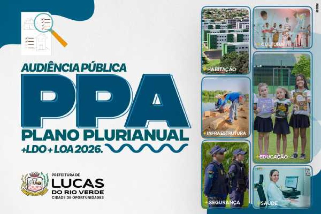 A Prefeitura de Lucas do Rio Verde promoverá no dia 2 de outubro de 2025 a audiência pública que debaterá a Lei Orçamentária Anual (LOA), referente ao ano de 2026, além do Plano Plurianual (PPA) 2026–2029 e Lei de Diretrizes Orçamentárias (LDO). O evento será realizado presencialmente às 18h, no Auditório da Câmara de Vereadores, e transmitido de forma on-line no Youtube.