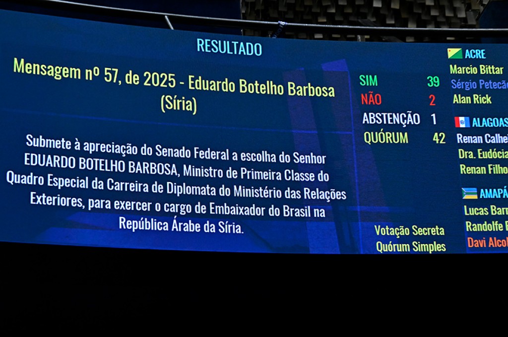 O Plenário do Senado aprovou, nesta quarta-feira (15), a indicação do diplomata João de Mendonça Lima Neto para chefiar a embaixada no Congo (MSF 62/2025). A embaixada também cuida das relações diplomáticas com a República Centro-Africana. Foram 41 votos a favor e um contrário.