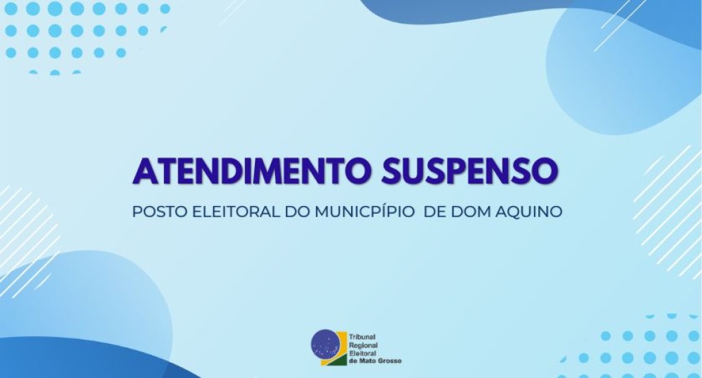 #DescriçãodaImagem: Com fundo azul e detalhes em tons de azul e branco nas laterais, ao meio da imagem está o texto: “Atendimento suspenso, Posto Eleitoral do Município de Dom Aquino”.