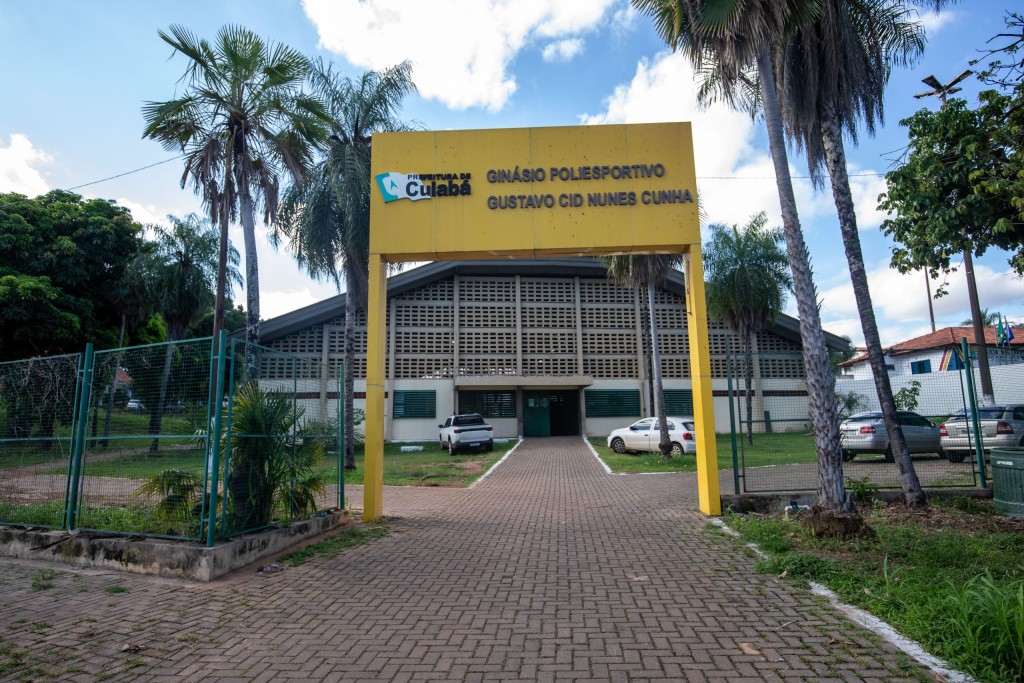 A imagem mostra a fachada do Complexo Esportivo “Gustavo Cid Nunes da Cunha”, o tradicional Ginásio da Lixeira.