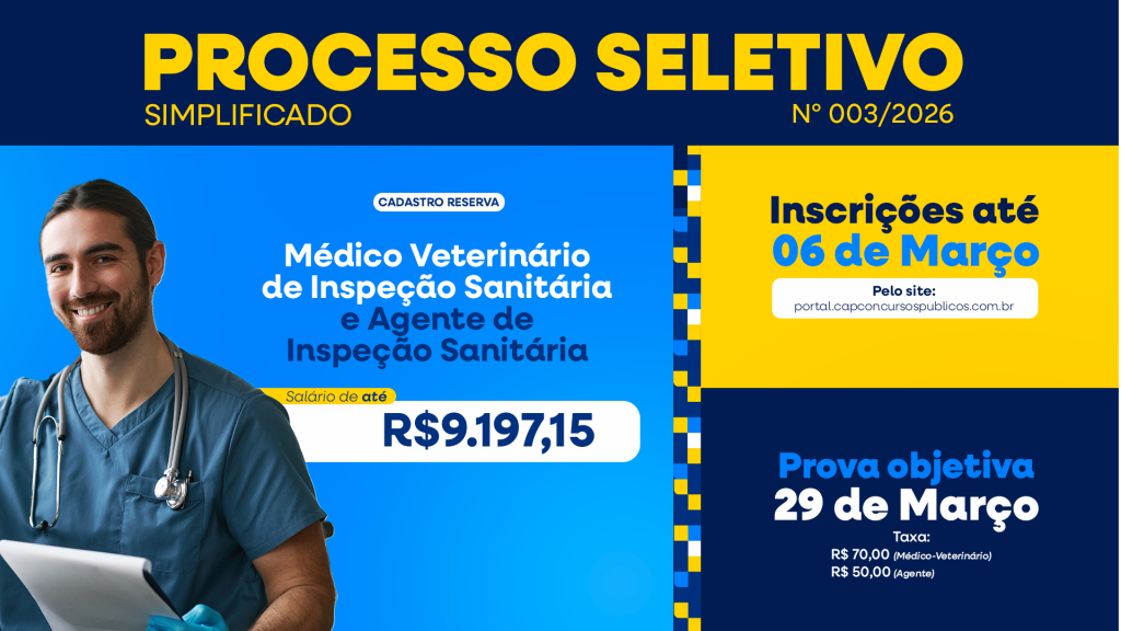 A taxa de inscrição será de R$70,00 para o cargo de Médico-Veterinário e de R$50,00 para o cargo de Agente de Inspeção Sanitária. Os candidatos que se enquadrarem nos critérios estabelecidos em edital poderão solicitar isenção da taxa nos dias 26 e 27 de fevereiro de 2026.