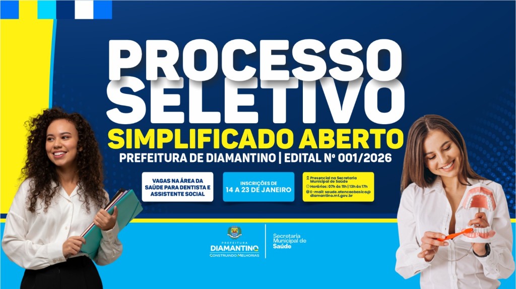 A Prefeitura de Diamantino, por meio da Secretaria Municipal de Saúde, informa a abertura do Processo Seletivo Simplificado nº 001/2026, que será realizado por meio de análise curricular, com o objetivo de contratar profissionais por prazo determinado de seis meses podendo ser prorrogado, para suprir necessidades emergenciais da rede municipal de saúde.