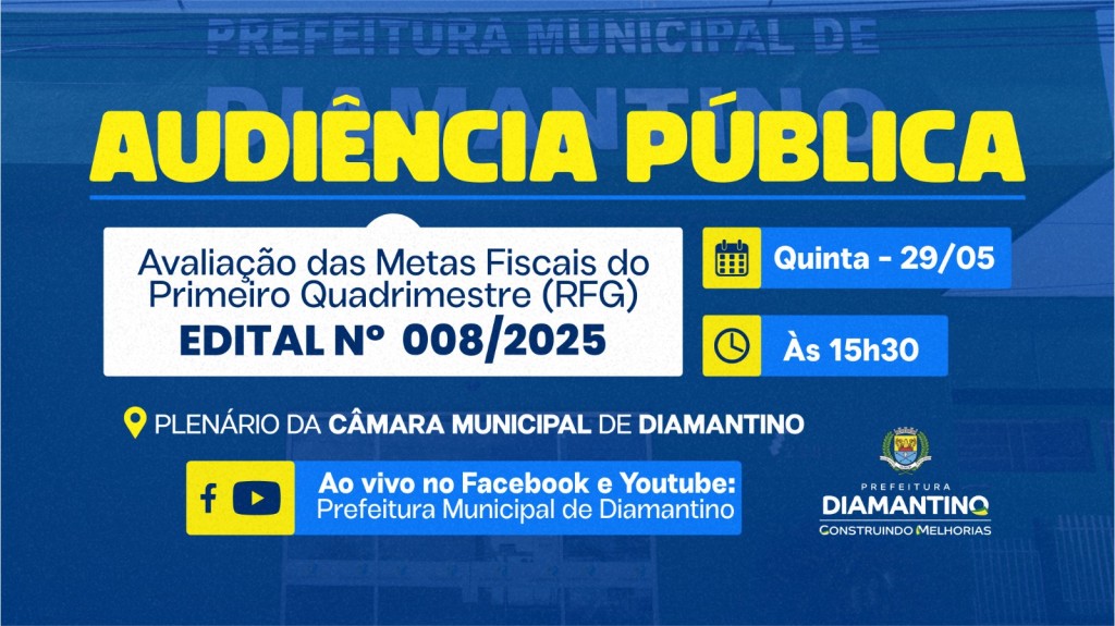 Por meio do Edital nº 008/2025 fica estabelecido que a audiência acontecerá na quinta-feira, dia 29 de maio, às 15h30, no Plenário da Câmara Municipal de Diamantino. A audiência também será transmitida pelas redes sociais oficiais da Prefeitura Municipal.