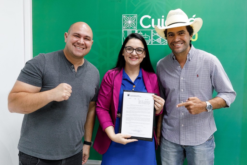 A foto mosta Samantha ao lado do prefeito Abilio e do deputado federal Thiago Boava, viúvo da deputada federal Amália Barros. Eles seguram a nova lei que institui a “Semana da Conscientização sobre as Doenças Oculares” no calendário oficial das escolas municipais.