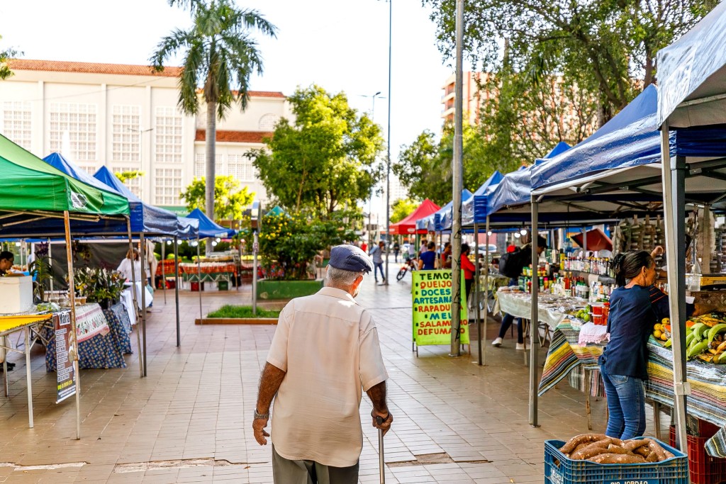 A imagem mostra um ambiente de feira na Praça Alencastro, com barracas expondo diversos produtos comercializados no local.