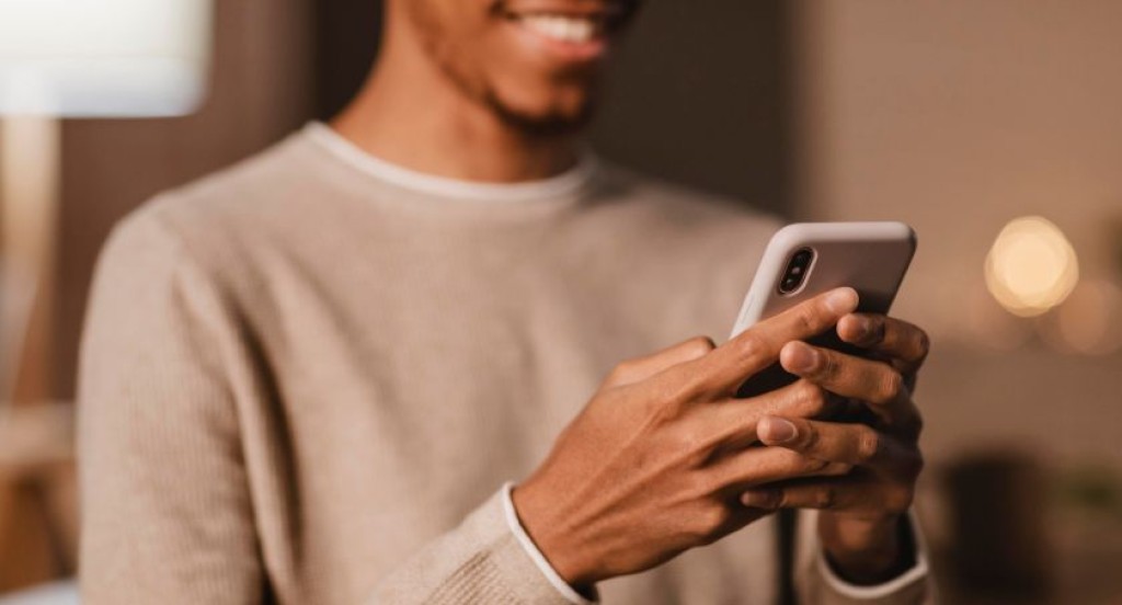 #PraTodosVerem – A imagem mostra um homem sorridente utilizando um smartphone, sugerindo operacionalizar o pagamento de débitos eleitorais via Pix. Ele veste uma blusa de malha bege e está em um ambiente interno com iluminação suave e desfocada ao fundo. A cena transmite uma sensação de descontração e foco na atividade com o celular.