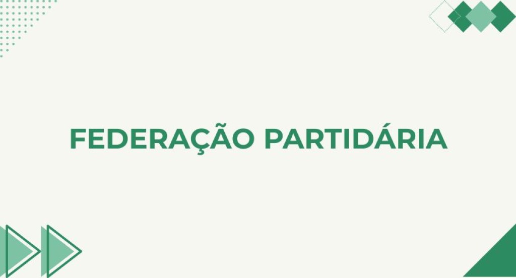 #PraTodosVerem: A imagem apresenta um slide com fundo claro e elementos gráficos em verde, contendo ao centro o título em destaque: “FEDERAÇÃO PARTIDÁRIA”. Nos cantos inferior esquerdo e superior direito há elementos visuais geométricos, como setas e losangos, que seguem uma identidade visual padronizada.