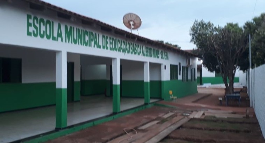 #ParaTodosVerem: Fachada da Escola Municipal de Educação Básica “Alberto Nunes da Silveira”. As paredes são brancas e verdes.