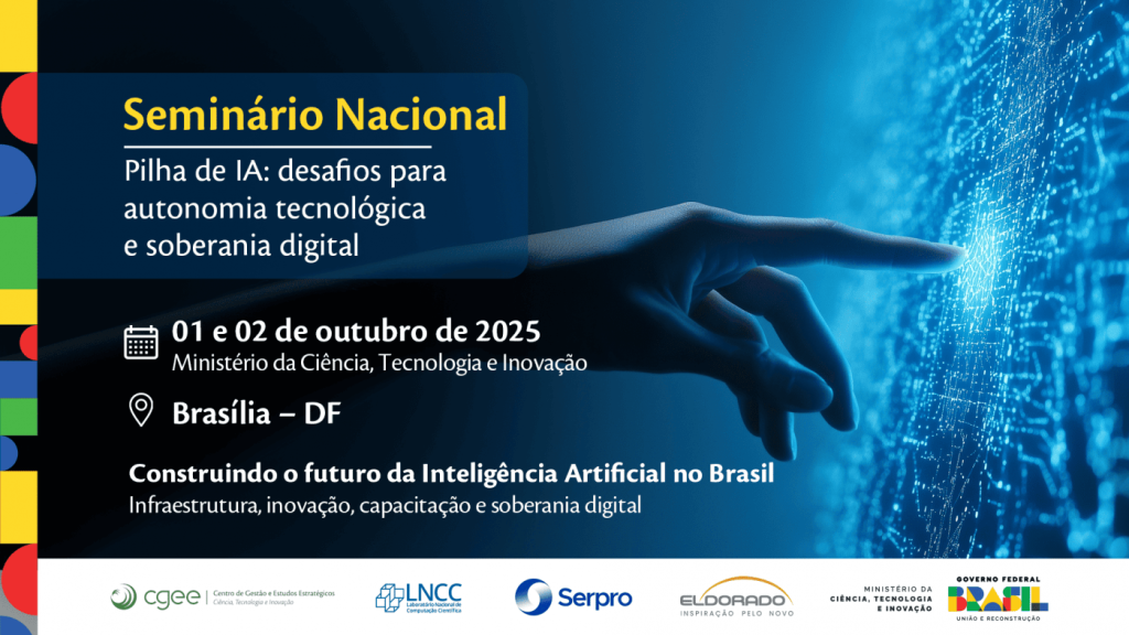 O Ministério da Ciência, Tecnologia e Inovação (MCTI) promove, em 1º e 2 de outubro, em Brasília (DF), o seminário Pilha de IA Nacional: Desafios para Autonomia Tecnológica e Soberania Digital. O evento será gratuito e presencial, na sede do Serviço Federal de Processamento de Dados (Serpro), com transmissão on-line.