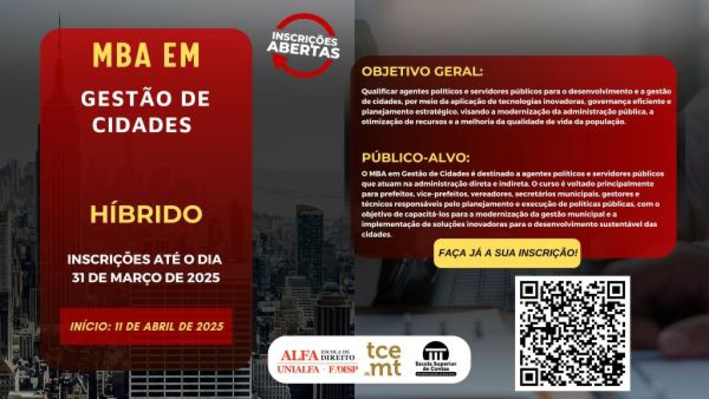 As inscrições para o MBA em Gestão de Cidades, lançado pelo presidente do Tribunal de Contas de Mato Grosso (TCE-MT), conselheiro Sérgio Ricardo, se encerram na próxima segunda-feira (31). Voltada a prefeitos, vice-prefeitos, vereadores, secretários e técnicos, a pós-graduação lato sensu será realizada em formato híbrido e busca modernizar a administração pública, otimizar recursos e melhorar a qualidade de vida da população. Clique aqui para se inscrever.