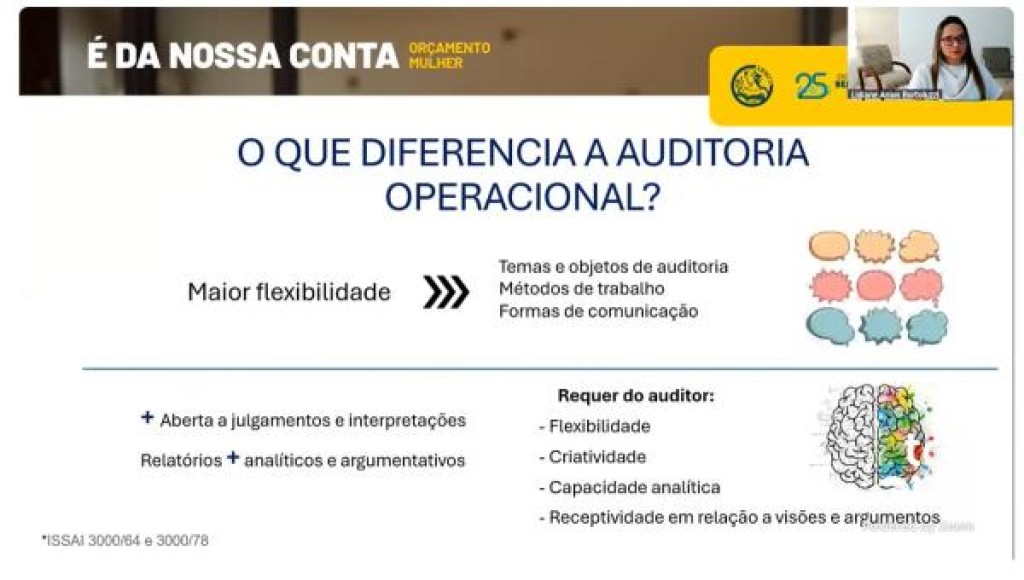 A auditora explicou as diferenças entre as auditorias de conformidade e auditorias operacionais, o funcionamento e condução de cada uma, bem como apresentou o trabalho da auditoria operacional sobre violência contra a mulher em Mato Grosso. “A auditoria operacional é mais contributiva e não exatamente para sancionar um gestor, então ela parte da colaboração do gestor e da vontade de melhorar aspectos da sua política e do seu governo. Chamar o controle social para atuar e exigir ações do gestor é muito importante”, explicou a auditora externa.