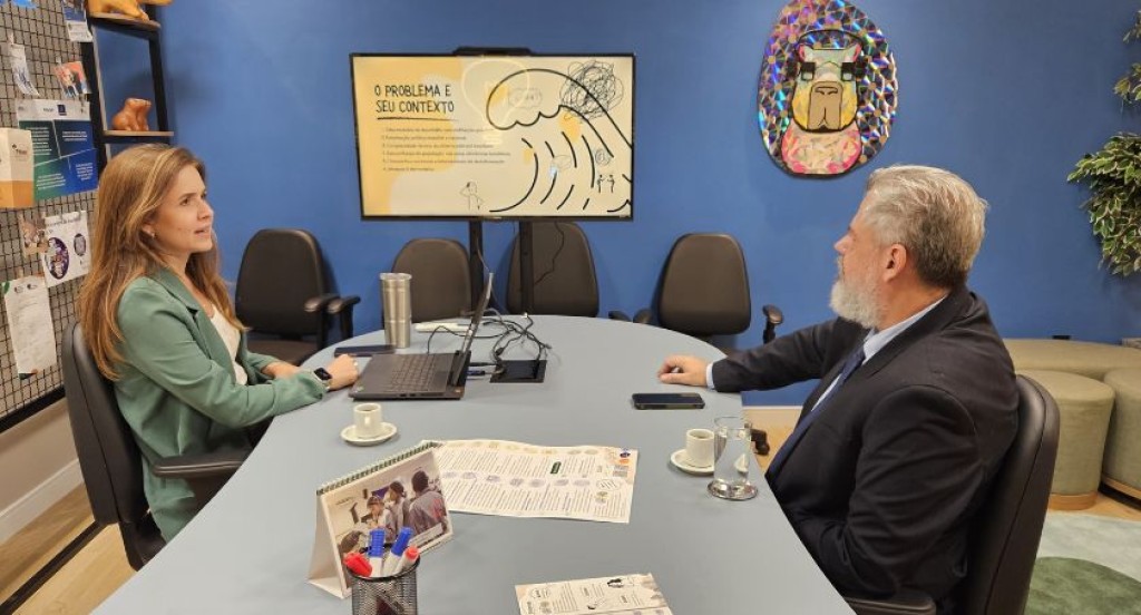 #PraTodosVerem: A imagem mostra duas pessoas — uma mulher e um homem — em uma reunião formal, sentados em uma sala moderna com decoração descontraída. Ambos observam atentamente uma apresentação exibida em uma tela, cujo slide traz o título “O problema e seu contexto” e ilustrações visuais em estilo gráfico. Sobre a mesa estão xícaras de café, papéis impressos, um notebook e materiais de escritório. Ao fundo, é possível ver uma parede azul com obras de arte e plantas decorativas, reforçando o ambiente colaborativo e inovador.