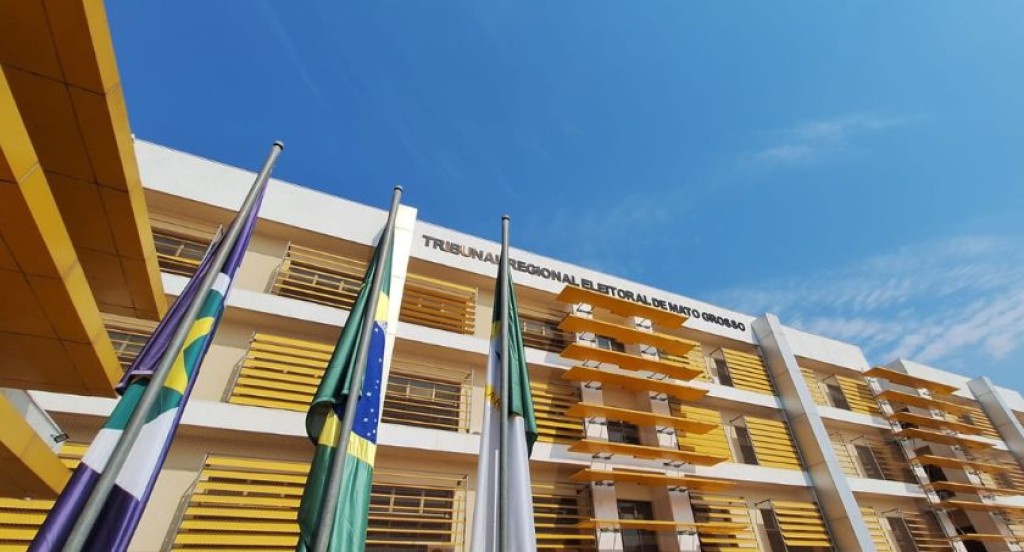 #PraTodosVerem – A imagem mostra a fachada de um prédio moderno de três andares, com janelas de persianas amarelas e a inscrição Tribunal Regional Eleitoral de Mato Grosso no topo. No primeiro plano, há três mastros com bandeiras do Brasil, de Cuiabá e a do estado de Mato Grosso, tremulando sob um céu azul claro com poucas nuvens. A foto é tirada de baixo para cima, o que enfatiza a altura da construção.