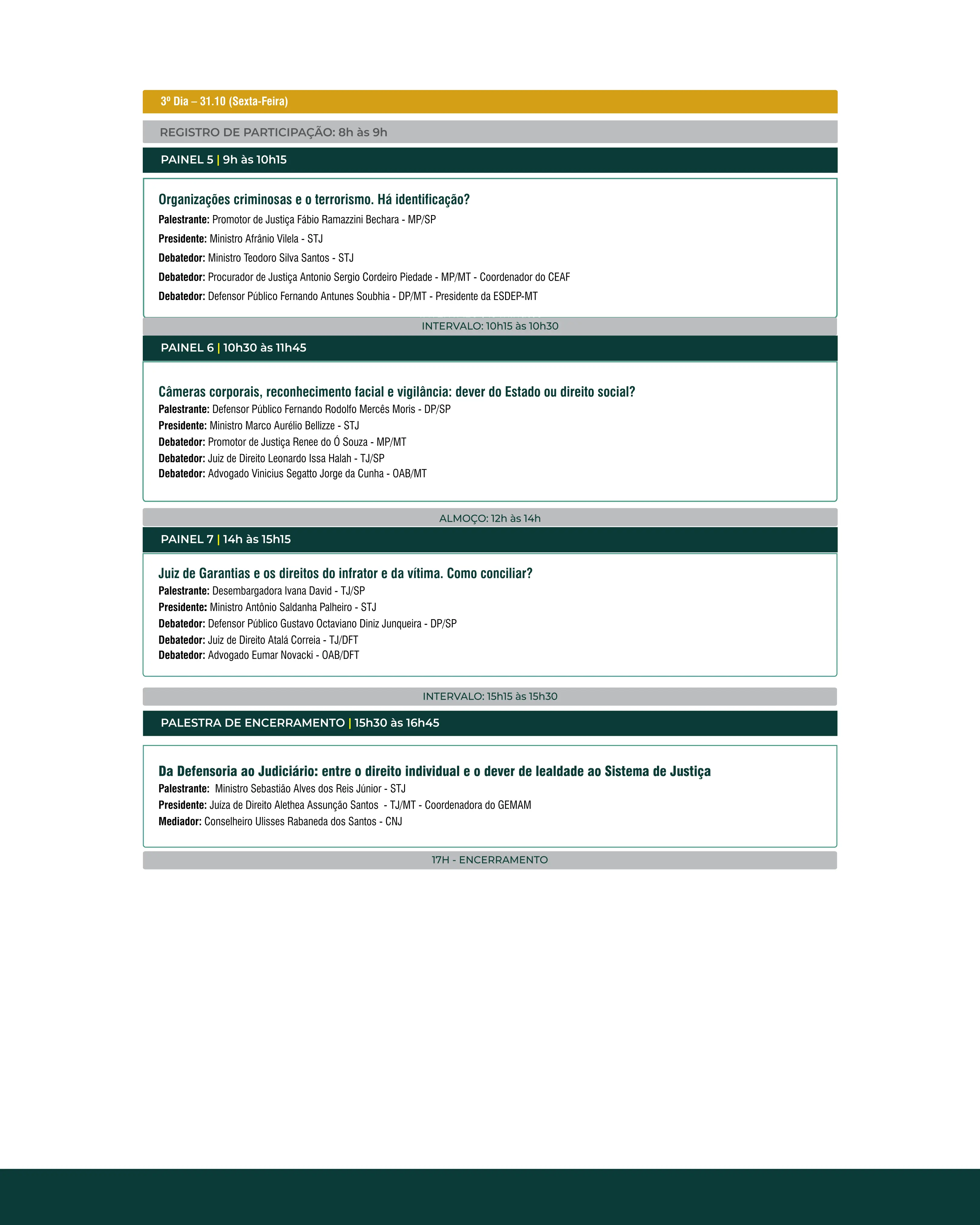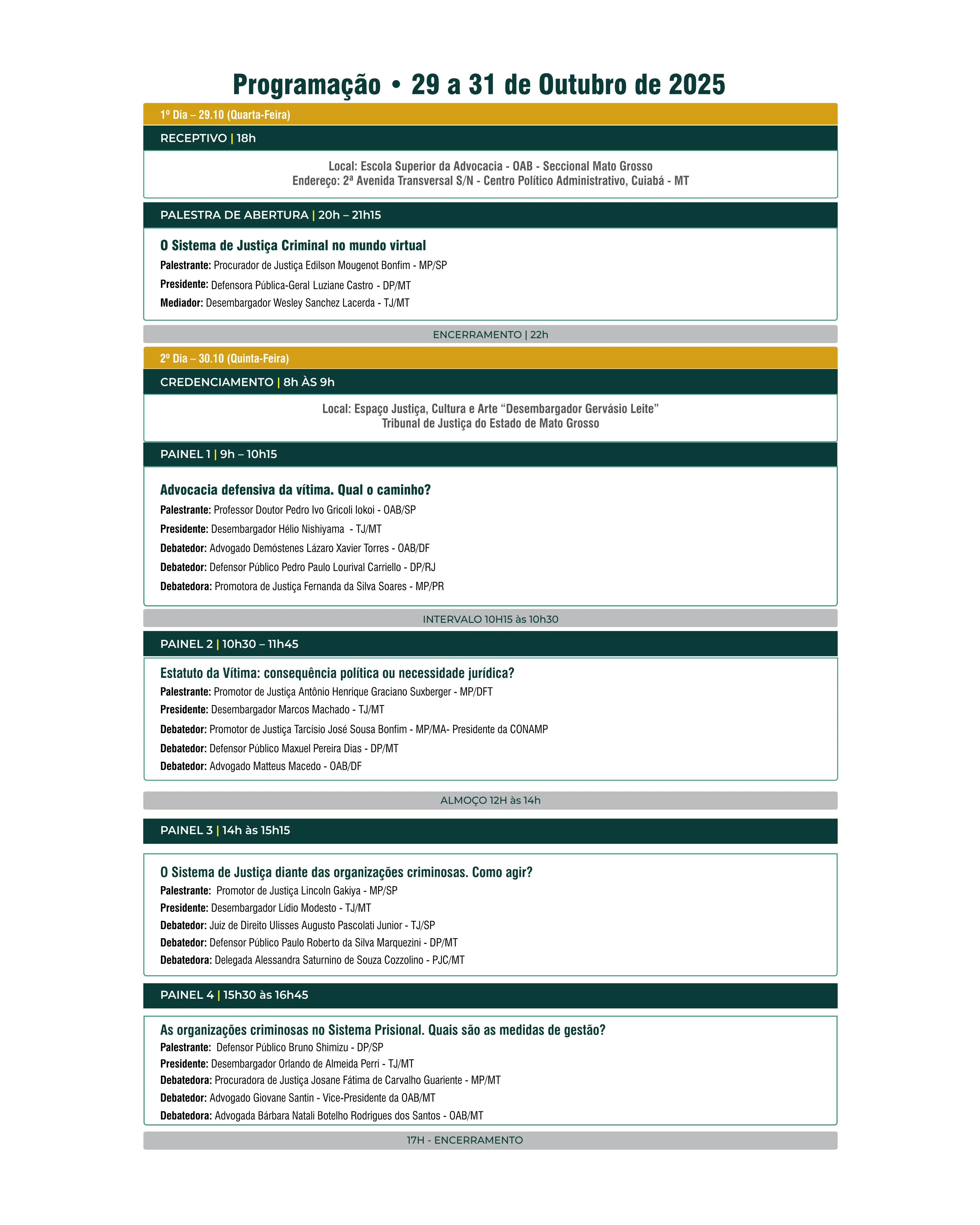 Vale destacar que o prazo para magistrados(as) das comarcas do interior interessados(as) em participar presencialmente se inscreverem encerrou-se em 10 de setembro. Já os que atuam nas comarcas de Cuiabá e Várzea Grande podem se inscrever para participar presencialmente até o dia 20 de outubro.