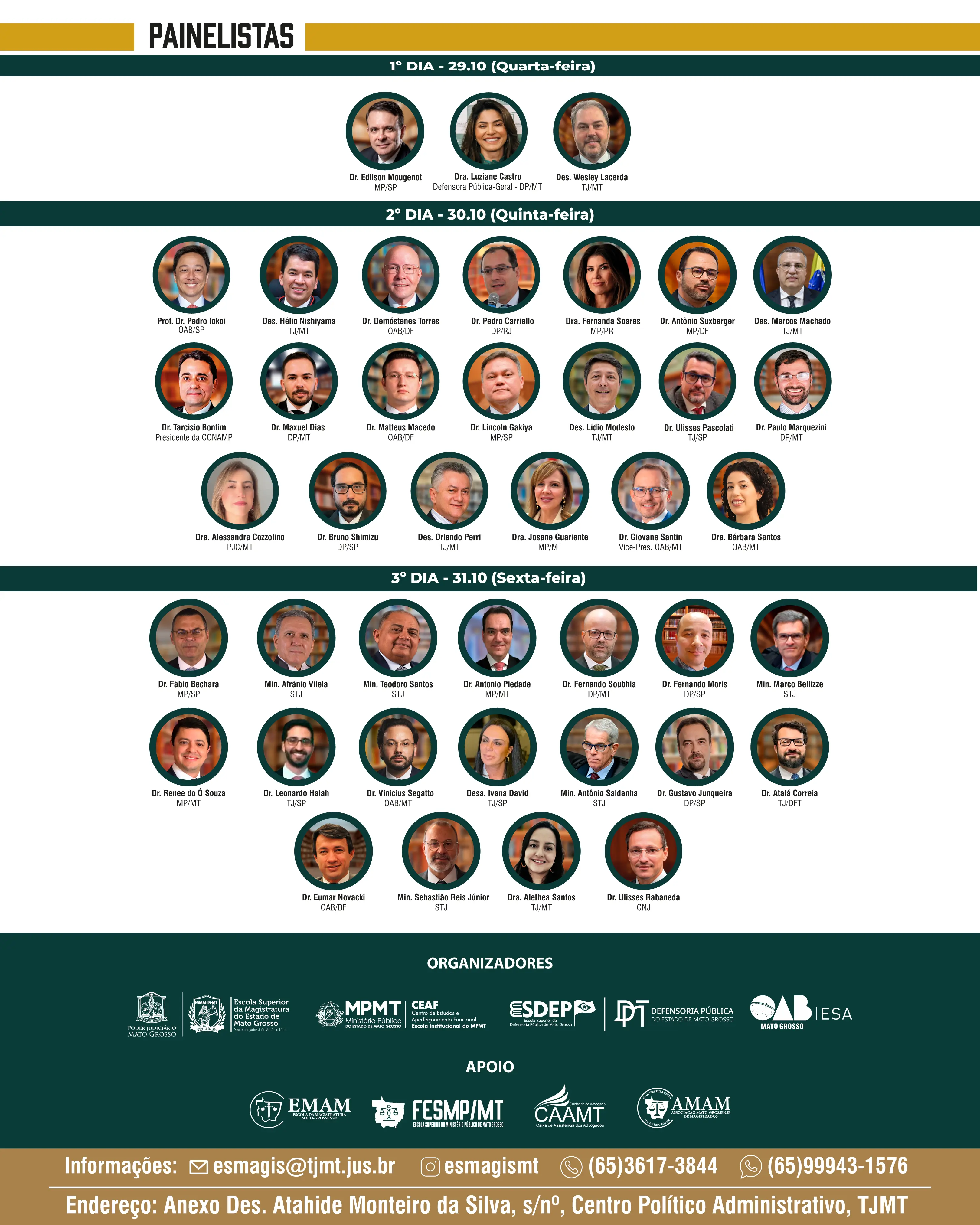 O evento é uma realização da Escola Superior da Magistratura de Mato Grosso (Esmagis-MT), em parceria com a Escola Superior da Advocacia de Mato Grosso (ESA/OAB-MT), o Centro de Estudos e Aperfeiçoamento Funcional (Ceaf) – Escola Institucional do Ministério Público Estadual (MPMT), a Escola Superior da Defensoria Pública de Mato Grosso (Esdep), e conta com apoio institucional da Fundação Escola Superior do Ministério Público de Mato Grosso (FESMP-MT), da Escola da Magistratura Mato-Grossense (Emam), da Associação Mato-grossense de Magistrados (Amam) e da Caixa de Assistência dos Advogados (CAA/MT).
